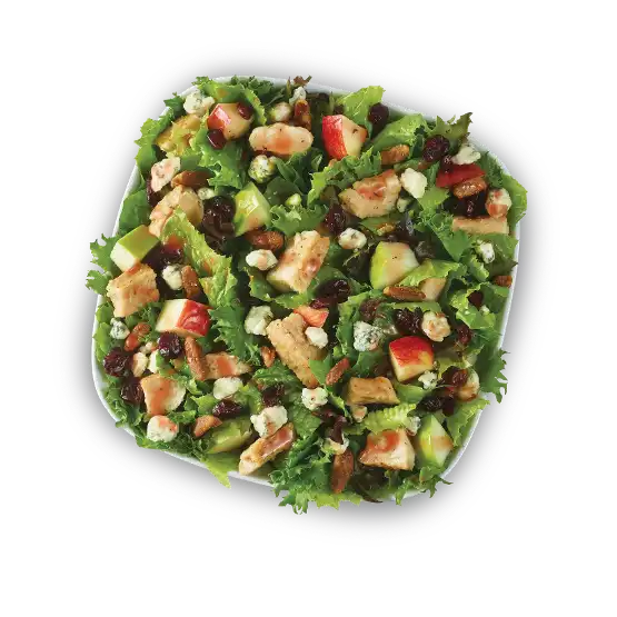 lettuce blend, crisp red and green apples, dried cranberries, roasted pecans, crumbled blue cheese, and grilled chicken, finished