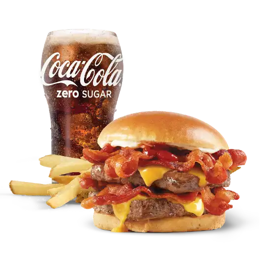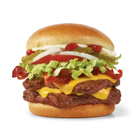 Two fresh, never-frozen beef patties with Applewood smoked bacon, cheese, ketchup, mustard, pickle, and onion, bacon makes the Double Stack even