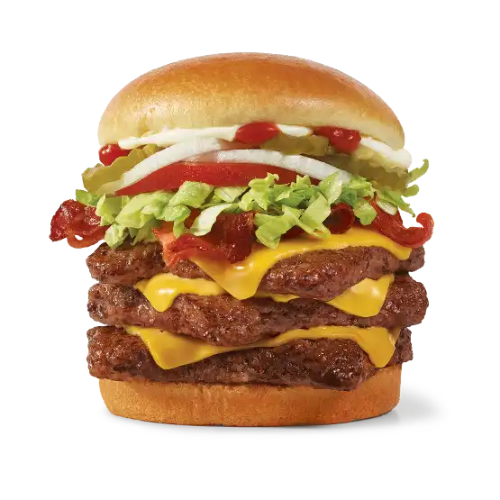 Three-quarters of a pound of fresh, never-frozen beef with Applewood smoked bacon, American cheese, crisp lettuce, tomato, pickle, onion