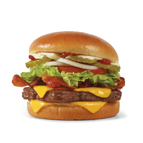 Fresh beef with Applewood smoked bacon, American cheese, crisp lettuce, tomato, pickle, onion, ketchup, and mayo on a toasted bun