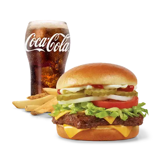quarter-pound of fresh beef topped with American cheese, crisp lettuce, tomato, pickle, onion, ketchup.