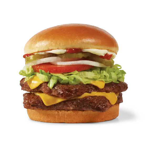 Two patties of fresh, never-frozen beef with cheese, ketchup, mustard, pickle, and oniondouble the beef, stacked with deliciousness.