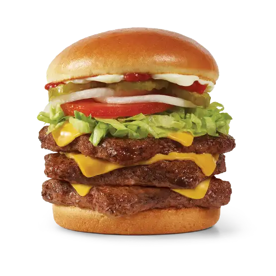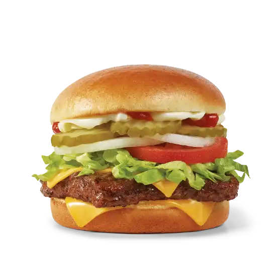 Three-quarters of a pound of fresh, never frozen beef topped with American cheese, crisp lettuce, tomato, pickle, onion, ketchup, and mayo on a toasted bun