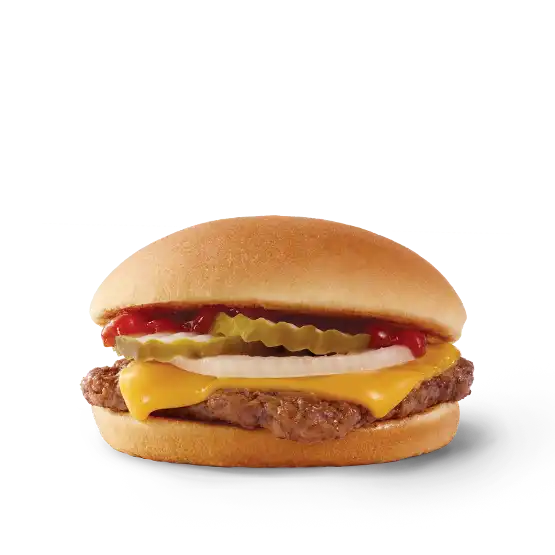 Fresh, never-frozen beef topped with cheese, pickles, onion, ketchup, and mustard on a warm bun, just right and just the right size.