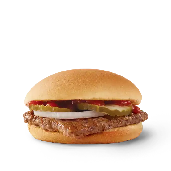 Fresh, never-frozen beef with pickles, onion, ketchup, and mustard on a warm bun, just right and just the right size.
